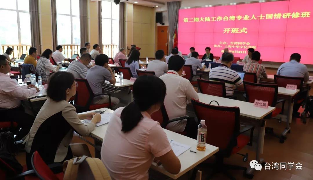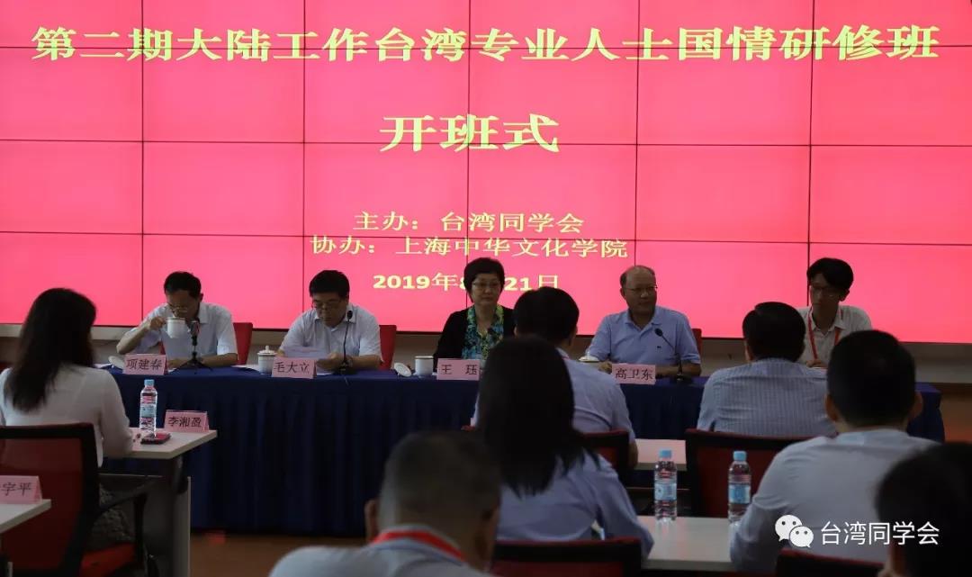 8月21日,由台湾同学会主办、上海中华文化学院协办的第二期大陆工作台湾专业人士国情研修班在上海中华文化学院凯旋校区正式开班。上海市委统战部副部长、上海海外联谊会副会长王珏出席开班式并讲话。上海中华文化学院常务副院长毛大立、台湾同学会秘书长高卫东分别致辞。毛大立常务副院长在致辞中说,上海是充满现代化气息的大都市,具有深厚的历史文化底蕴和独特的海派文化魅力。大家可以通过课堂和考察,从不同视角感受上海改革开放的成就、历史文化的缩影,把握时代的脉络。他强调,两岸是命运与共的骨肉兄弟,我们是一家人,希望大家通过国情研修班,深化认识、消除隔阂,为两岸经济文化融合、两岸同胞心灵契合作贡献。高卫东秘书长代表陈云英会长向各位学员的到来表示热烈欢迎。他简单介绍了台湾同学会的概况和举办国情研修班的由来。他说,台湾同学会举办的大陆任教台湾教师座谈会是解决大家生活上的问题,而国情研修班则是想帮助大家提升对祖国大陆的政治、经济、文化方面的理解和认识。王珏副部长代表上海市委统战部、上海海外联谊会向研修班开班表示热烈祝贺,向各位学员的到来表示热烈欢迎。她说,去年的第一期国情研修班为相似背景的乡亲搭建学习交流平台,为学员更好适应和融入祖国大陆的生活创造了条件。今年的研修班,内容更加丰富,教学形式更为多样。各位学员知识层次高,专业影响大,希望大家通过这次研修,从上海这个窗口,进一步加深对基本国情的了解,深化对国家发展的认识,加强对国家大趋势的把握,为今后祖国统一大业贡献力量。开幕式由上海中华文化学院中华文化培训交流处处长项建春主持。